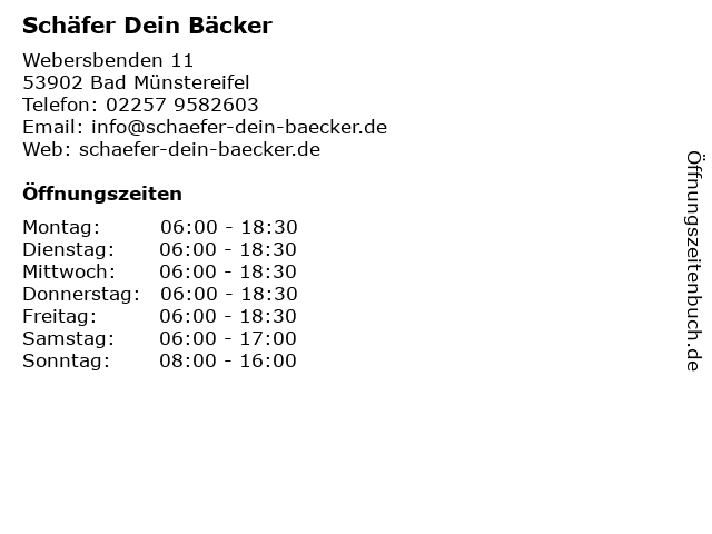 | Öffnungszeiten Schäfer Dein Bäcker in Bad Münstereifel anzeigen | |