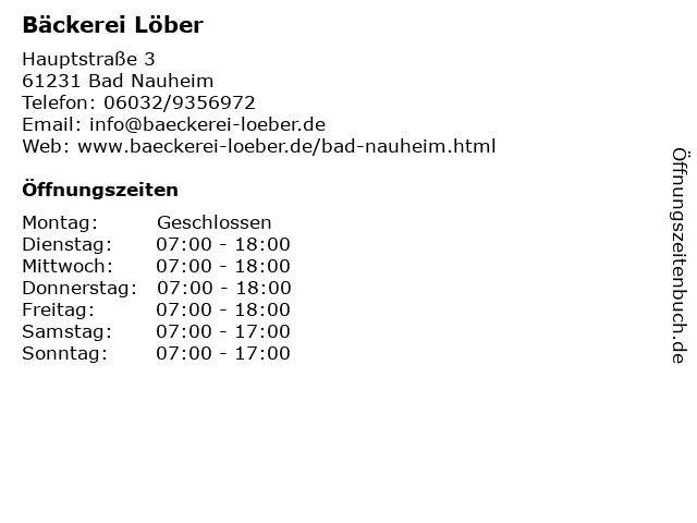 | Öffnungszeiten Bäckerei Löber in Bad Nauheim anzeigen | |