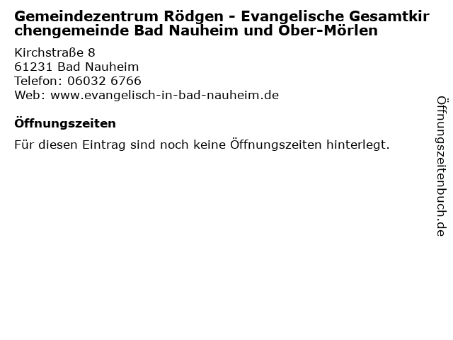 | Gemeindezentrum Rödgen - Evangelische Gesamtkirchengemeinde Bad Nauheim und Ober-Mörlen anrufen | |
