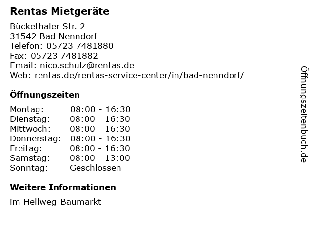 | Öffnungszeiten Rentas Mietgeräte in Bad Nenndorf anzeigen | |