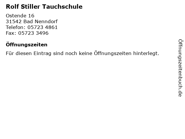 | Öffnungszeiten Rolf Stiller Tauchschule in Bad Nenndorf anzeigen | |