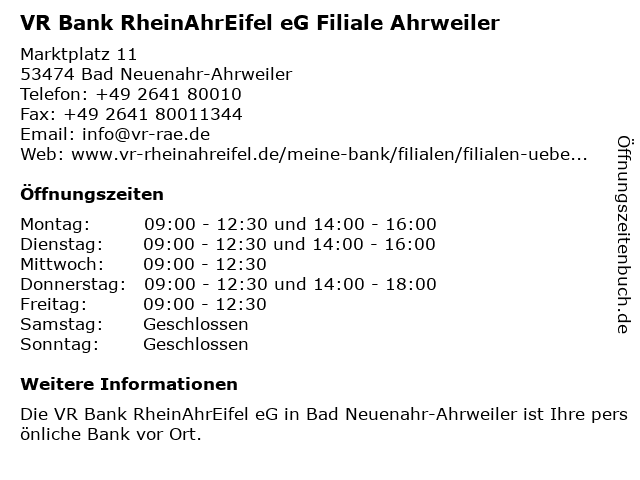 1 Volksbank RheinAhrEifel eG - (Geldautomat Filiale) (Entfernung: 1,37 km) Wilhelmstraße 60, 53474 Bad Neuenahr-Ahrweiler 2 VR Bank RheinAhrEifel eG Filiale Bad Neuenahr (Entfernung: 3,01 km) Hauptstraße 119, 53474 Bad Neuenahr-Ahrweiler 5 VR Bank RheinAhrEifel eG, SB Filiale Augustinum (Entfernung: 4,22 km) Am Schwanenteich 1, 53474 Bad Neuenahr-Ahrweiler 6 VR-Bank Bonn Rhein-Sieg eG, RegionalCenter Grafschaft-Ringen (IPR) (Entfernung: 4,26 km) Joseph-von-Fraunhofer-Straße 1, 53501 Grafschaft |