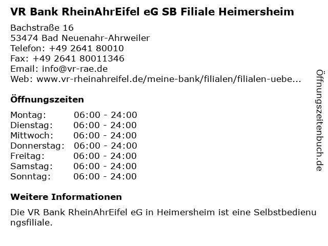 2 VR Bank RheinAhrEifel eG, SB Filiale Augustinum (Entfernung: 1,63 km) Am Schwanenteich 1, 53474 Bad Neuenahr-Ahrweiler 5 Kreissparkasse Ahrweiler (SB-Geschäftsstelle) (Entfernung: 4,62 km) Wilhelmstraße 60, 53474 Bad Neuenahr-Ahrweiler 6 VR Bank RheinAhrEifel eG, SB Filiale Königsfeld (Entfernung: 5,10 km) Hauptstraße 2, 53426 Königsfeld |