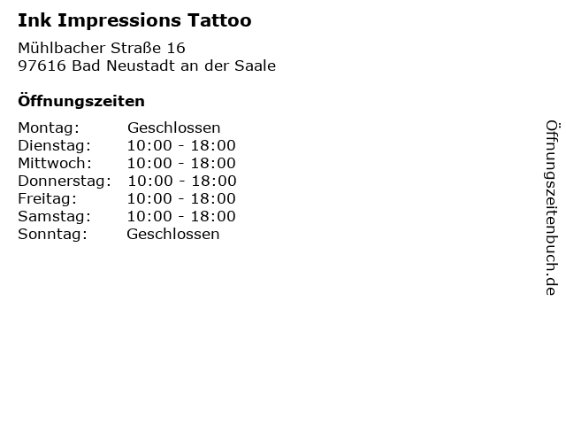 | Öffnungszeiten Ink Impressions Tattoo in Bad Neustadt an der Saale anzeigen | |