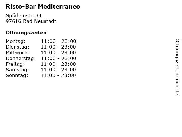 | Öffnungszeiten Risto-Bar Mediterraneo in Bad Neustadt anzeigen | |