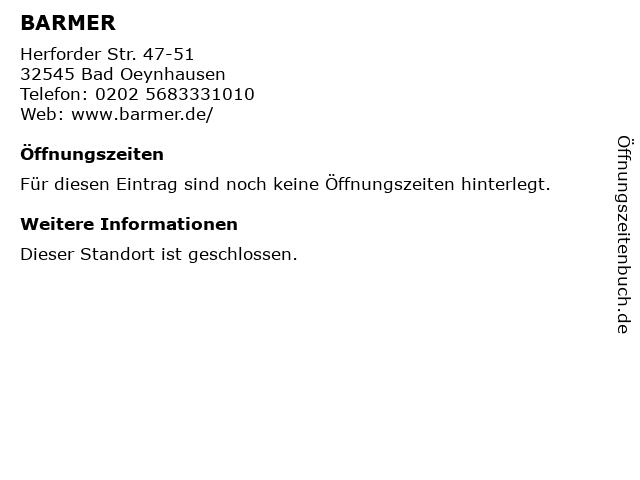 | Öffnungszeiten BARMER in Bad Oeynhausen anzeigen | |