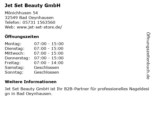 | Öffnungszeiten Jet Set Beauty GmbH in Bad Oeynhausen anzeigen | |