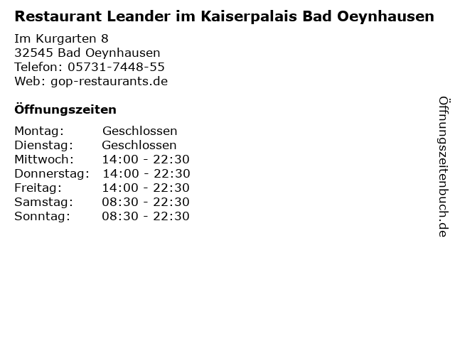 Branchen & Suchbegriffe zu Restaurant Leander im Kaiserpalais Bad Oeynhausen:bad, gop, kaiserpalais, leander, restaurant |