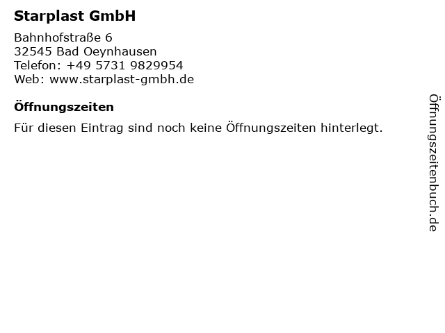 | Öffnungszeiten Starplast GmbH in Bad Oeynhausen anzeigen | |