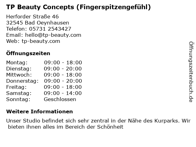 Branchen & Suchbegriffe zu TP Beauty Concepts (Fingerspitzengefühl):ausbildungszentrum, beauty, concepts, fingerspitzengefühl, haarentfernung: waxing, klinik für permanent make-up, kosmetikgeschäft, schönheitssalon, tp, wimpernstudio |