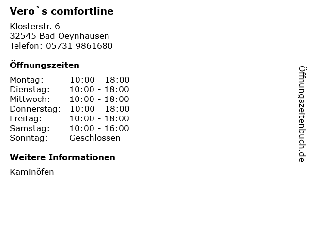 | Öffnungszeiten Vero`s comfortline in Bad Oeynhausen anzeigen | |