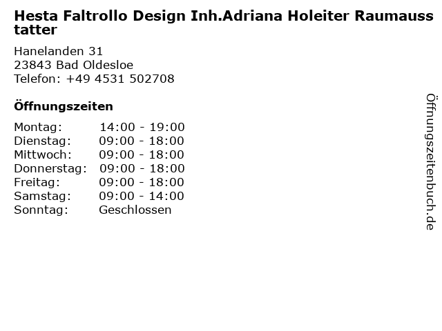 2 Raumausstatter Weiland & Humfeldt GbR Polstereien (Entfernung: 18,27 km) Kronsheider Str. 41, 23812 Wahlstedt 3 Rana Chakravorty - Raumausstatter (Ausstellung) (Entfernung: 18,30 km) Spenglerstrasse 6, 23556 Lübeck 4 Ingwersen, Telse, Kniff & Pfiff - textile Raumgestaltung (Entfernung: 8,77 km) Matthias-Claudius-Str. 25a, 23858 Reinfeld 6 Malerbetrieb in Bad Segeberg, Kasch Malerarbeiten & Raumgestaltung, Inh Martin Simon (Entfernung: 16,06 km) Kühneweg 1, 23795 Bad Segeberg |