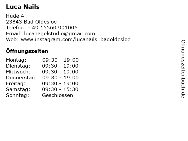 | Öffnungszeiten Luca Nails in Bad Oldesloe anzeigen | |