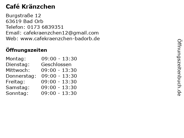 | Öffnungszeiten Café Kränzchen in Bad Orb anzeigen | |