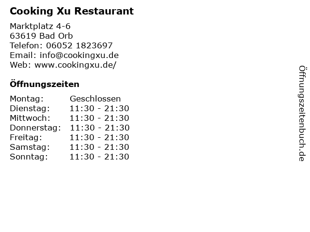 | Öffnungszeiten Cooking Xu Restaurant in Bad Orb anzeigen | |