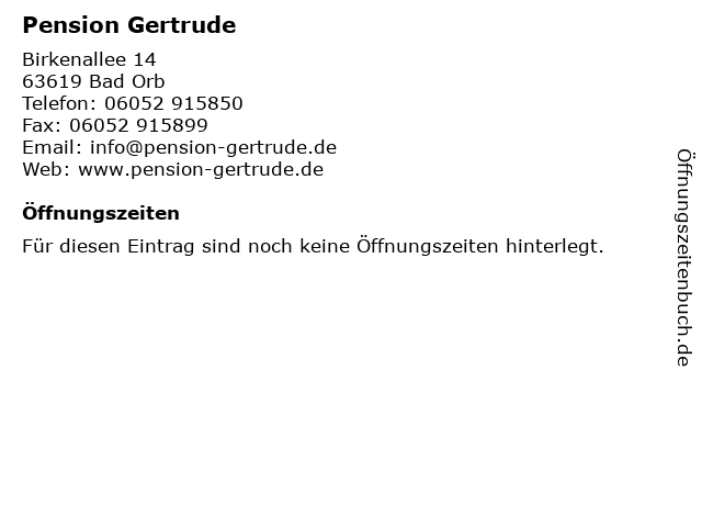 | Öffnungszeiten Pension Gertrude in Bad Orb anzeigen | |