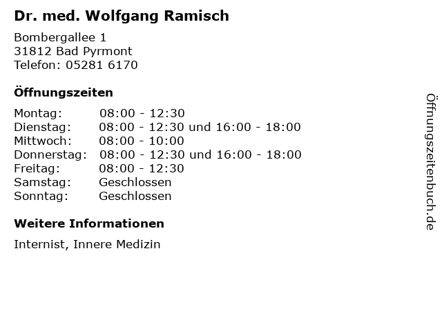 | Öffnungszeiten Dr. med. Wolfgang Ramisch in Bad Pyrmont anzeigen | |