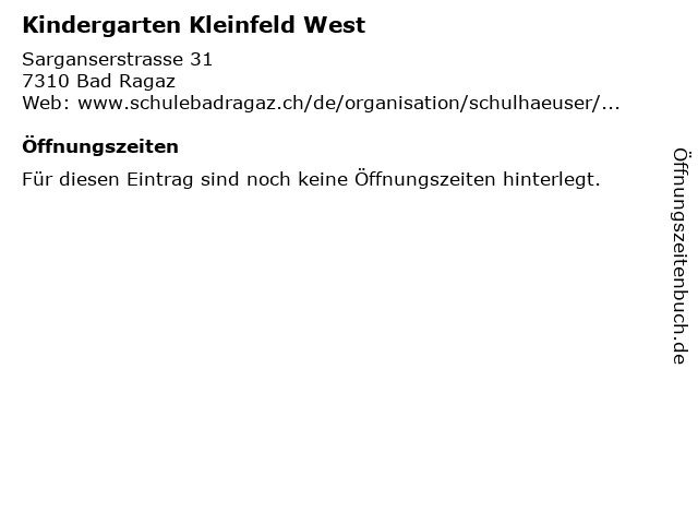 | Öffnungszeiten Kindergarten Kleinfeld West in Bad Ragaz anzeigen | |