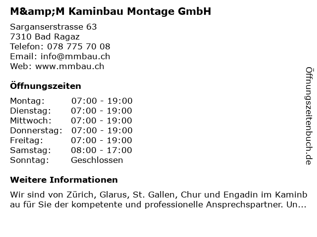 | Öffnungszeiten M&M Kaminbau Montage GmbH in Bad Ragaz anzeigen | |