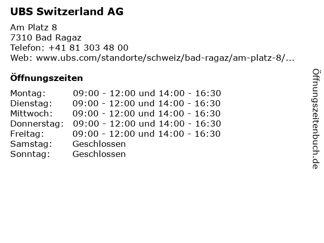 | Öffnungszeiten UBS Switzerland AG in Bad Ragaz anzeigen | |