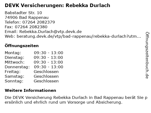 Branchen & Suchbegriffe zu DEVK Versicherungen: Rebekka Durlach:altersvorsorge, autoversicherung, berufsunfähigkeitsversicherung, devk, durlach, gebäude- und hausratsversicherung, gewerbeversicherung, kfz-versicherung (motorrad), lebensversicherung, mietrechtsschutzversicherung, rebekka, reiseversicherungsagentur, versicherungen |