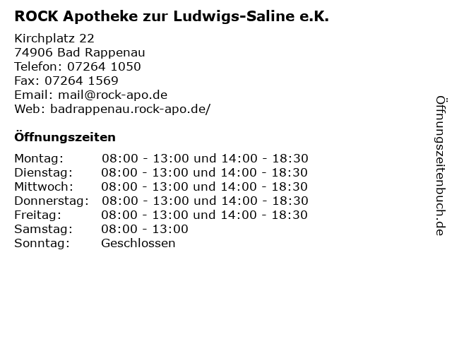Branchen & Suchbegriffe zu ROCK Apotheke zur Ludwigs-Saline e.K.:apotheke, apotheke in bad rappenau, apotheke zur ludwigs-saline, e.k., ludwigs, rock, saline, zur |