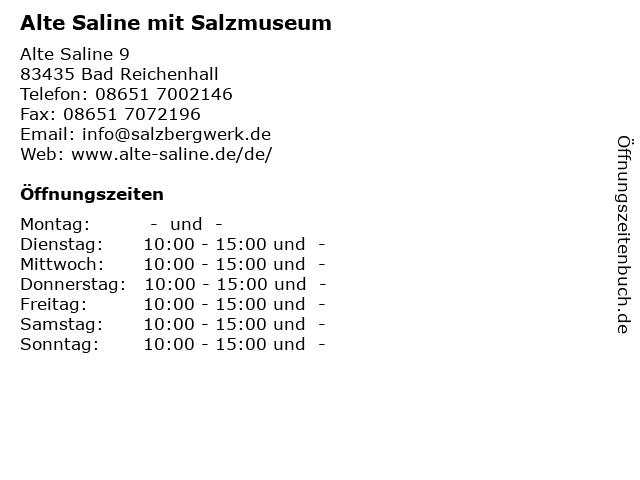 2 Fuchs - Physiotherapie und Fitness in der alten Saline (Entfernung: 0,05 km) Alte Saline 3, 83435 Bad Reichenhall 4 Alte Saline Bad Reichenhall (Mai-Okt.) (Entfernung: 0,69 km) Reichenbachstraße , 83435 Bad Reichenhall 5 Alte Saline Bad Reichenhall (Nov.-April) (Entfernung: 0,69 km) Reichenbachstraße , 83435 Bad Reichenhall 6 |
