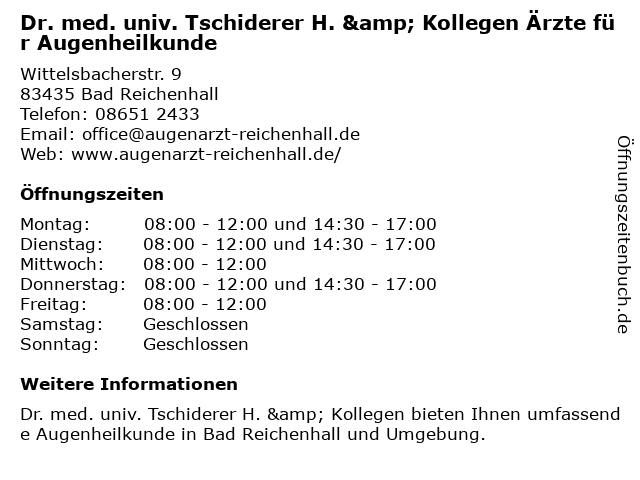 1 med. univ. Augenarzt Dr. Tschiderer H. Dr. Ärzte für Augenheilkunde (Entfernung: 0,00 km) Wittelsbacherstr. 9, 83435 Bad Reichenhall 2 Priv.-Doz. Dr. Christian Nischler - Facharzt für Augenheilkunde und Optometrie (Entfernung: 14,53 km) Strubergasse 26, 5020 Salzburg 3 Dr. Sarah Moussa - Fachärztin für Augenheilkunde und Optometrie (Entfernung: 14,60 km) Müllner hauptstraße 48, 5020 Salzburg 4 Universitätsklinik für Augenheilkunde u Optometrie (Entfernung: 14,63 km) Müllner hauptstraße 48, 5020 Salzburg 5 Dr.med.univ. Dieter Dworzak -Augenheilkunde (Entfernung: 14,74 km) Münchner Straße 23, 83395 Freilassing 6 Dr. Scharmann: Augenarzt Salzburg - Facharzt für Augenheilkunde (Entfernung: 15,45 km) Dr.-franz-rehrl-platz 2, 5020 Salzburg |