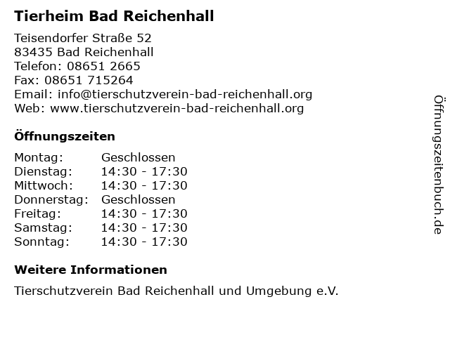 3 Tierschutzverein Bad Reichenhall u.U. e.V. (Gassigehzeiten) (Entfernung: 0,00 km) Teisendorfer Str. 52, 83435 Bad Reichenhall 4 Tierschutzverein für Stadt und Land Salzburg (Entfernung: 9,34 km) Karolingerstrasse 13a, 5020 Salzburg 6 |