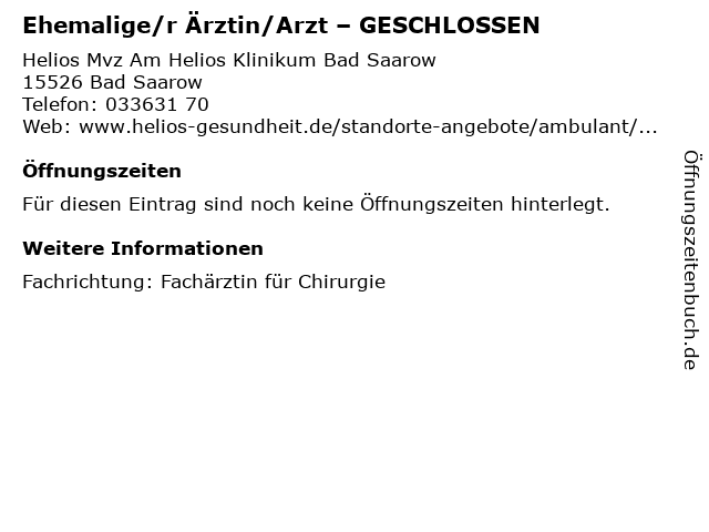 1 Ehemalige/r Ärztin/Arzt – GESCHLOSSEN (Entfernung: 0,02 km) Helios Mvz Am Helios Klinikum Bad Saarow , 15526 Bad Saarow 2 Ehemalige/r Ärztin/Arzt – GESCHLOSSEN (Entfernung: 10,15 km) Medizinische Einrichtungsgesellschaft , 15517 Fürstenwalde 3 Ehemalige/r Ärztin/Arzt – GESCHLOSSEN (Entfernung: 10,16 km) Medizinische Einrichtungsgesellschaft , 15517 Fürstenwalde 4 Ehemalige/r Ärztin/Arzt – GESCHLOSSEN (Entfernung: 17,54 km) Mvz Am Helios Klinikum Bad Saarow , 15848 Beeskow 6 |