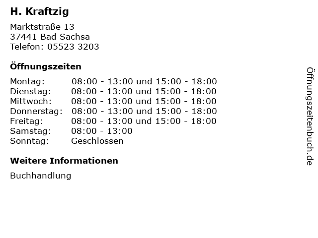 | Öffnungszeiten H. Kraftzig in Bad Sachsa anzeigen | |