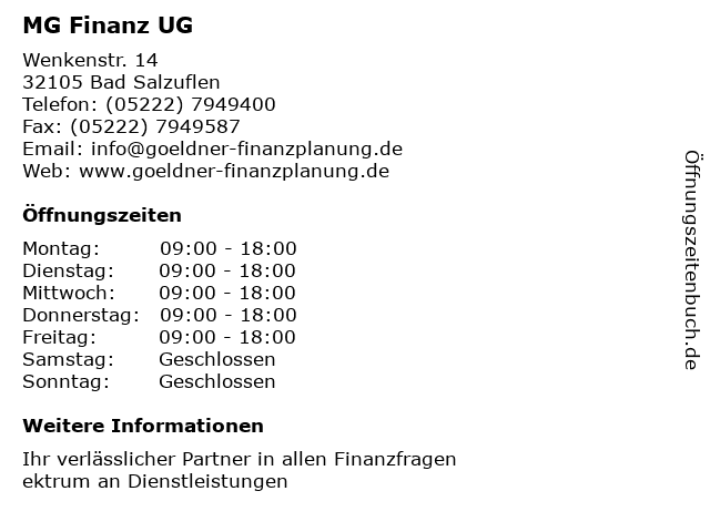 | Öffnungszeiten MG Finanz UG in Bad Salzuflen anzeigen | |