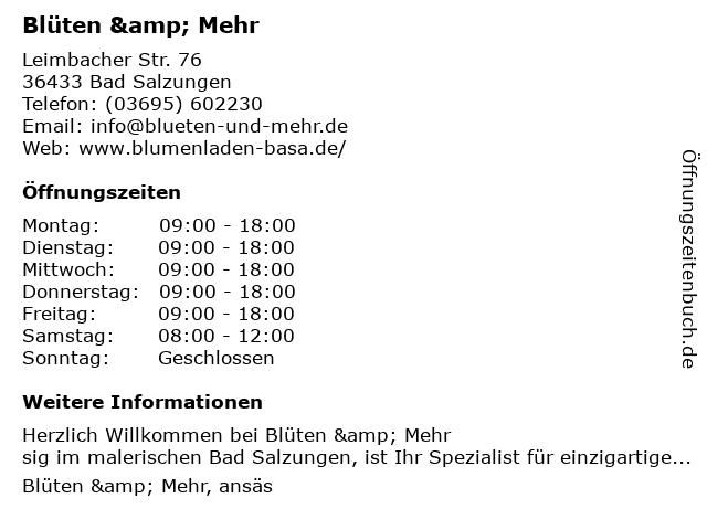 | Öffnungszeiten Blüten & Mehr in Bad Salzungen anzeigen | |