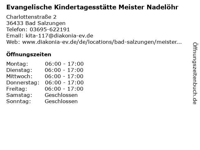 1 Ev. Kindertagesstätte Meister Nadelöhr (Entfernung: 0,02 km) Karl-Liebknecht-Str. 2, 36433 Bad Salzungen 4 Evangelische Altenhilfe Gesundbrunnen Altenhilfezentrum Haus Werragarten (Entfernung: 9,43 km) Frauenbreitunger Weg 38, 98597 Breitungen 6 |
