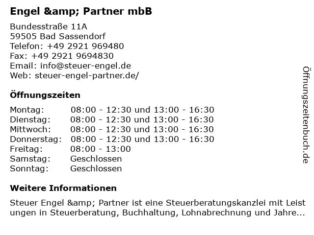 | Öffnungszeiten Engel & Partner mbB in Bad Sassendorf anzeigen | |