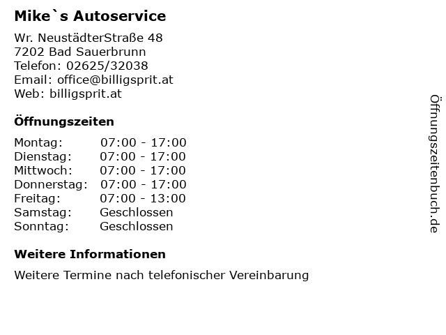 | Öffnungszeiten Mike`s Autoservice in Bad Sauerbrunn anzeigen | |