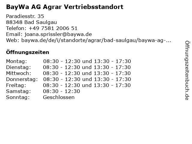 Öffnungszeiten BayWa AG Agrar Vertriebsstandort in Bad Saulgau anzeigen