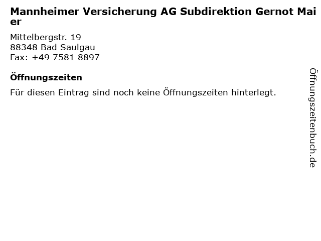 | Öffnungszeiten Mannheimer Versicherung AG Subdirektion Gernot Maier in Bad Saulgau anzeigen | |