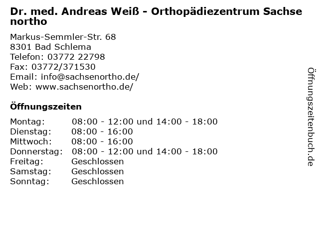 1 Dr. med. Andreas Weiß - Orthopädiezentrum Sachsenortho (Entfernung: 0,00 km) Markus-Semmler-Str. 68, 08301 Bad Schlema 2 Chirurgisch-Orthopädische Gemeinschaftspraxis - Dr. med. Andreas Weiß (Entfernung: 0,00 km) Markus-Semmler-Str. 68, 08301 Bad Schlema 3 Bergarbeiter-Krankenhaus Schneeberg gGmbH - Kompetenzzentrum für chirurgische und orthopädische Erkrankungen (Entfernung: 1,15 km) Goethestraße 3, 08289 Schneeberg 4 Zahnärztliche Gemeinschaftspraxis Leichsenring und Tzscheutschler (Entfernung: 2,00 km) Gartenstr. 21, 08289 Schneeberg 6 Gemeinschaftspraxis für Ergotherapie und Logopädie Anne-Karen Voigt und Petra Teichert (Entfernung: 3,44 km) Altmarkt 2, 08280 Aue |