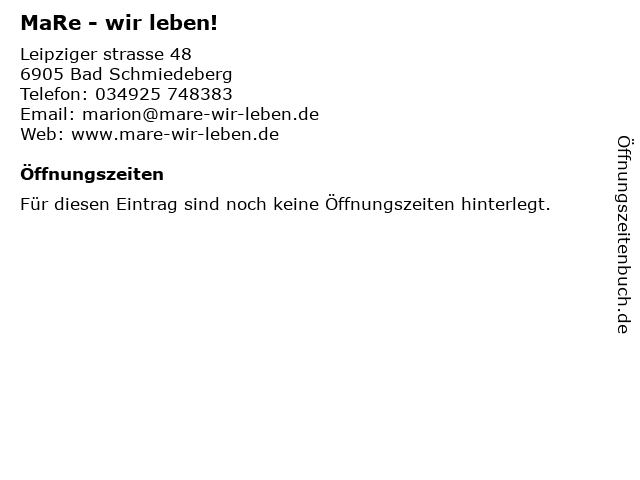 | Öffnungszeiten MaRe - wir leben! in Bad Schmiedeberg anzeigen | |