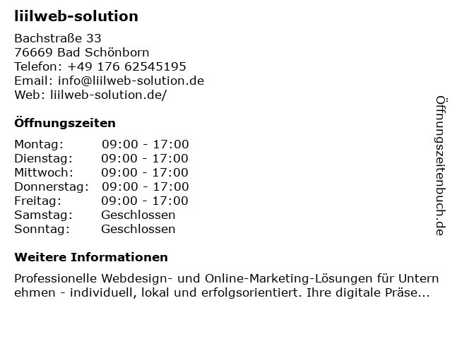 | Öffnungszeiten liilweb-solution in Bad Schönborn anzeigen | |
