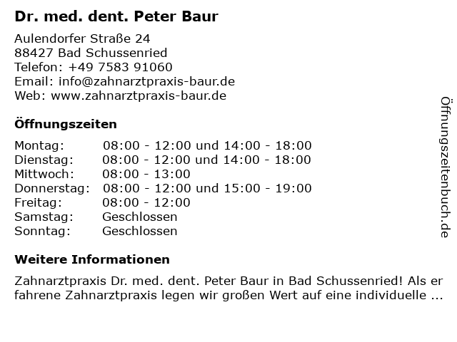 1 Dr.med.dent. Albrecht Haase Zahnarzt (Entfernung: 0,42 km) Wilhelm-Schussen-Straße 28, 88427 Bad Schussenried 2 Baur Anton u. Tobias GbR Geflügelhof (Entfernung: 2,48 km) Otterswanger Weg 4, 88427 Bad Schussenried 3 Medizinisches Versorgungszentrum Dr. med. dent. Martina König & Kollegen (Entfernung: 11,20 km) Bismarckstraße 25, 88361 Altshausen 5 Dr. Med.Dent.Limberg Dr.Med.Dent.Holch (Entfernung: 11,42 km) Herzog-Albrecht-Allee 14, 88361 Altshausen 6 |