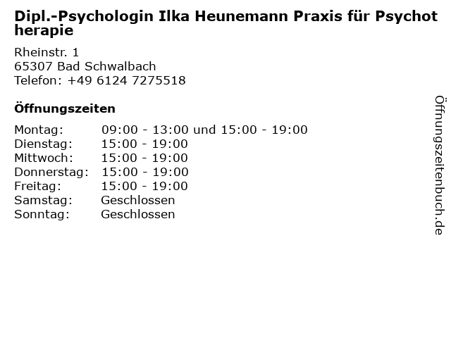 1 Dipl.-Psychologin Jutta Knab Praxis für Psychotherapie (Entfernung: 0,00 km) Rheinstr. 1, 65307 Bad Schwalbach 2 Dipl.-Psychologin Alice Quasrawi Psychotherapeutische Praxis (Entfernung: 12,63 km) Walkmühlstr. 1, 65195 Wiesbaden 4 6 Gabriele Haas Psychologin und Psychotherapeutin (Entfernung: 14,08 km) Sonnenberger Str. 22, 65193 Wiesbaden |