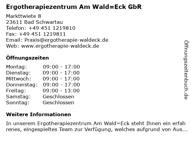 2 4 Gemeinschaftspraxis für Ergotherapie - Anna-Maria Eck und Cornelia Hinz (Entfernung: 5,02 km) Schwartauer Allee 65b, 23554 Lübeck 6 Café Engels Eck / Café Wichtig (Entfernung: 10,45 km) Timmendorfer Platz 3, 23669 Timmendorfer Strand |