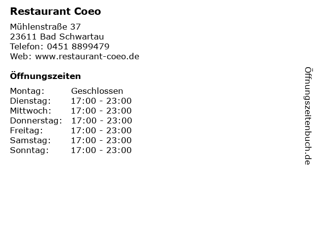 | Öffnungszeiten Restaurant Coeo in Bad Schwartau anzeigen | |