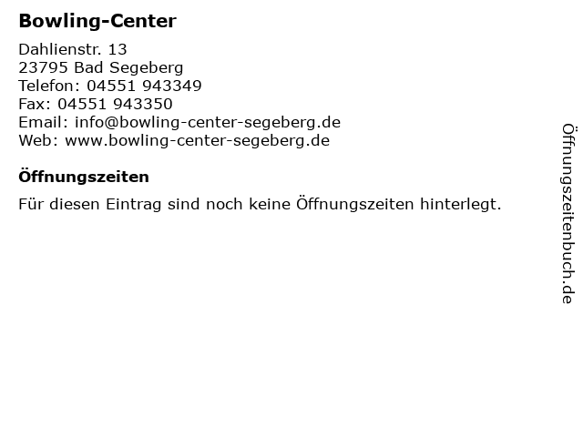 | Öffnungszeiten Bowling-Center in Bad Segeberg anzeigen | |
