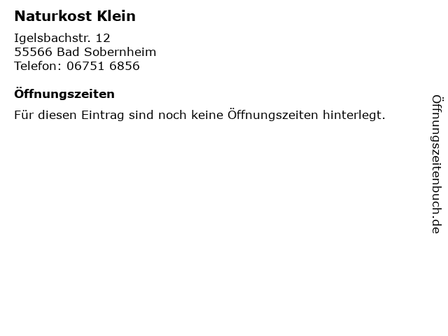 | Öffnungszeiten Naturkost Klein in Bad Sobernheim anzeigen | |