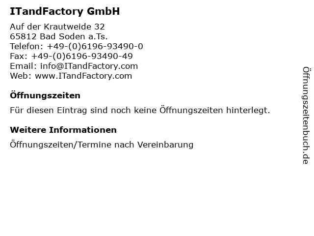 | Öffnungszeiten ITandFactory GmbH in Bad Soden a.Ts. anzeigen | |