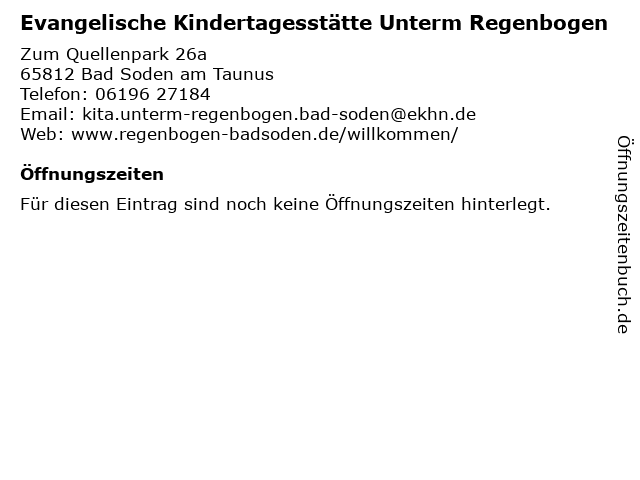 1 Evangelische Kindertagesstätte Unterm Regenbogen (Entfernung: 7,39 km) Rossertstr. 26, 65817 Eppstein 3 Evangelische Kirche Bad Soden am Taunus - Evangelische Kirchengemeinde Bad Soden (Entfernung: 0,03 km) Zum Quellenpark 26, 65812 Bad Soden am Taunus 5 Evangelische Kirchengemeinde Bad Soden (Entfernung: 0,36 km) Zum Quellenpark 54, 65812 Bad Soden am Taunus 6 Evangelische Familienbildung Main-Taunus im Haus der Kirche - Büro (Entfernung: 0,90 km) Händelstraße 52, 65812 Bad Soden |
