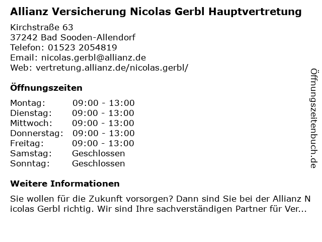 1 Allianz Versicherung Thomas Gerbl Generalvertretung (Entfernung: 0,00 km) Kirchstraße 63, 37242 Bad Sooden-Allendorf 2 Thomas Gerbl Versicherungen (Entfernung: 0,77 km) Heiligenstädter Str. 17, 37242 Bad Sooden-Allendorf 3 Allianz Versicherung Anjo Dirk Hauptvertretung (Entfernung: 12,03 km) Straße Der Einheit 126, 37318 Uder 5 Allianz Versicherung Sebastian Koch Hauptvertretung (Entfernung: 15,80 km) Petristraße 2, 37308 Heilbad Heiligenstadt 6 Kathrin Ebel Allianz Hauptvertretung (Entfernung: 16,43 km) Wilhelmstr. 87, 37308 Heilbad Heiligenstadt |